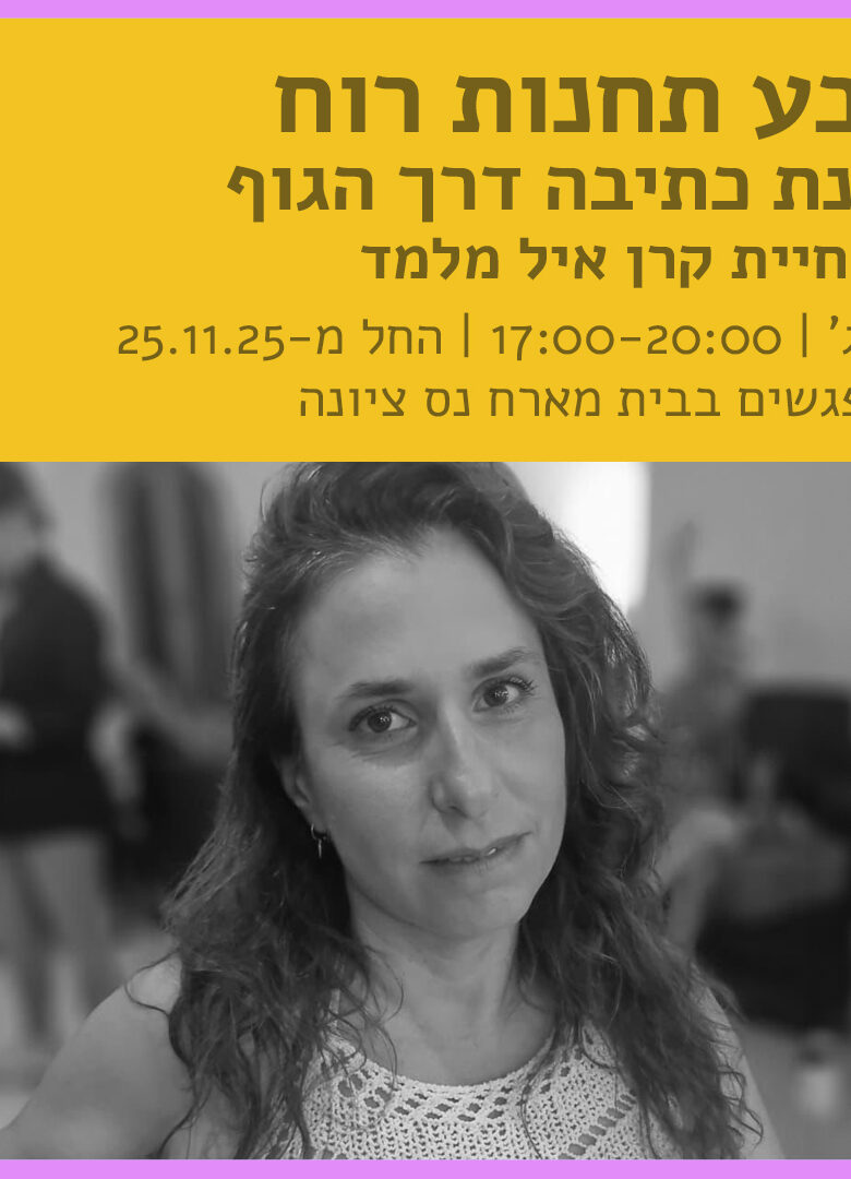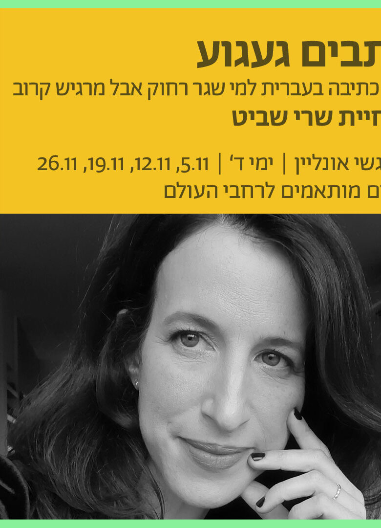 במרחב כתיבה מוגן ננסה לתת למילים להצמיח לנו רגליים להלך בהן באומץ בין האין לבין היש. נכתוב את הגעגוע, את הכמיהה, נכתוב אהבה.