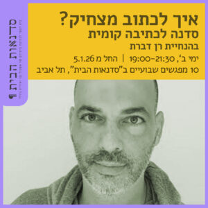 סדנא מעשית בת עשרה מפגשים תחשוף אתכם לכלי העבודה של הכותב הקומי ותתרגל אותם אתכם באווירה נעימה ובסביבה בונה.